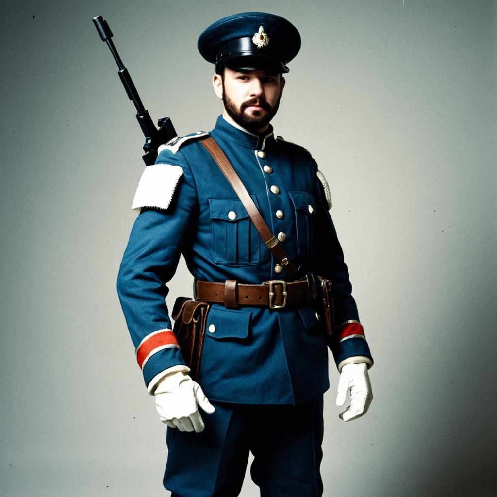 Full-body portrait of a man wearing a traditional card soldier costume featuring a blue uniform with gold buttons, white gloves, brown leather belt and holster, red cuffs, and a matching blue cap with an emblem. He has facial hair and stands holding a weapon over his right shoulder against a neutral background.