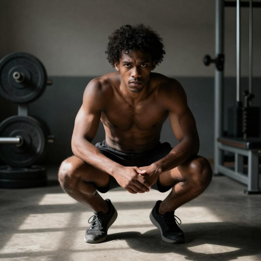 Muscular, shirtless black man with curly hair, crouching in dimly lit industrial room. Sunbeams cast shadows on concrete floor. Gym equipment in background, including weight plates and barbell. Man's intense, focused expression. Metallic pipes on right.