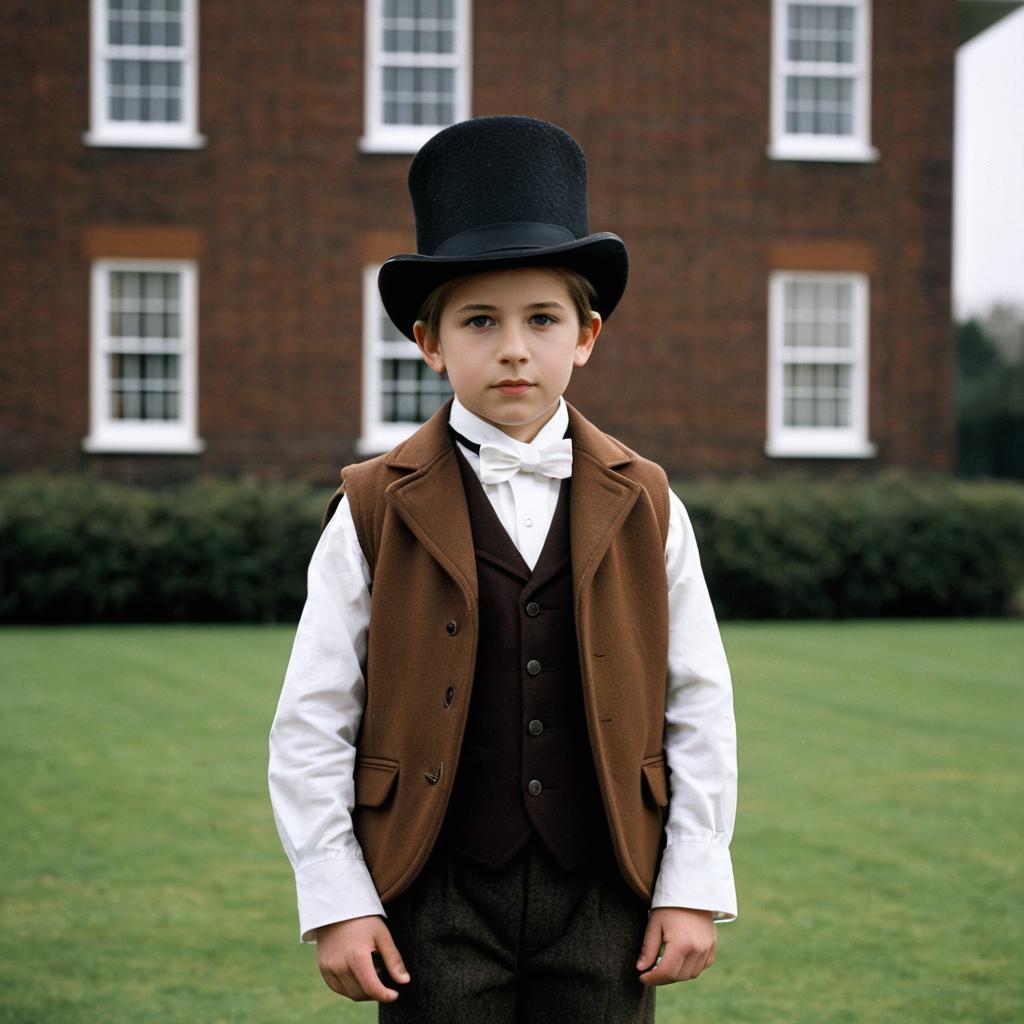 Portrait of a young boy wearing a traditional Dickensian outfit outdoors. He is dressed in a brown vest and coat over a white long-sleeve shirt, with an elegant white bow tie and dark pants. The boy is also wearing a classic tall black top hat. The background shows a brick building with white-trimmed windows and a green lawn, creating a historic and vintage atmosphere.