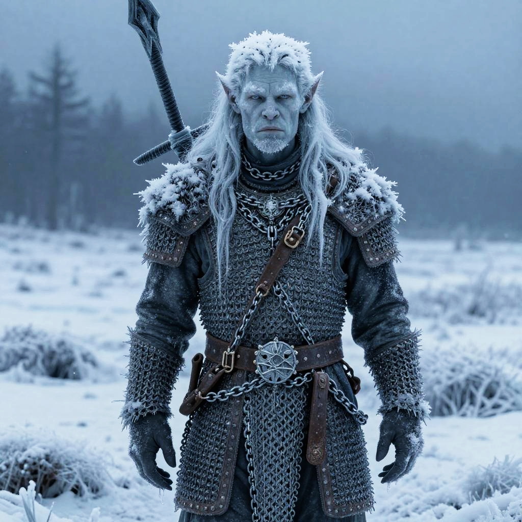 A frost giant wearing icy chainmail, surrounded by frozen tundra, art inspired by Elena Gordon.