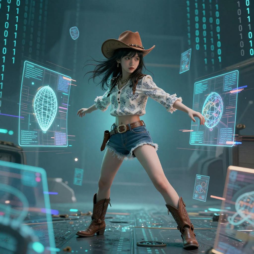 (masterpiece, best quality, ultra detailed, hyper realistic, photo), delicate pattern, detailed background, 1girl, solo, cute, cowboy shot, action pose, afloat, binary code and digital art, binary code, digital art, only zero and one, hologram, virtual space, wireframe, GlitchingBodyPart, glitch, aqua tone, cinematic lighting, punk, mysterious, ray tracing, 8k