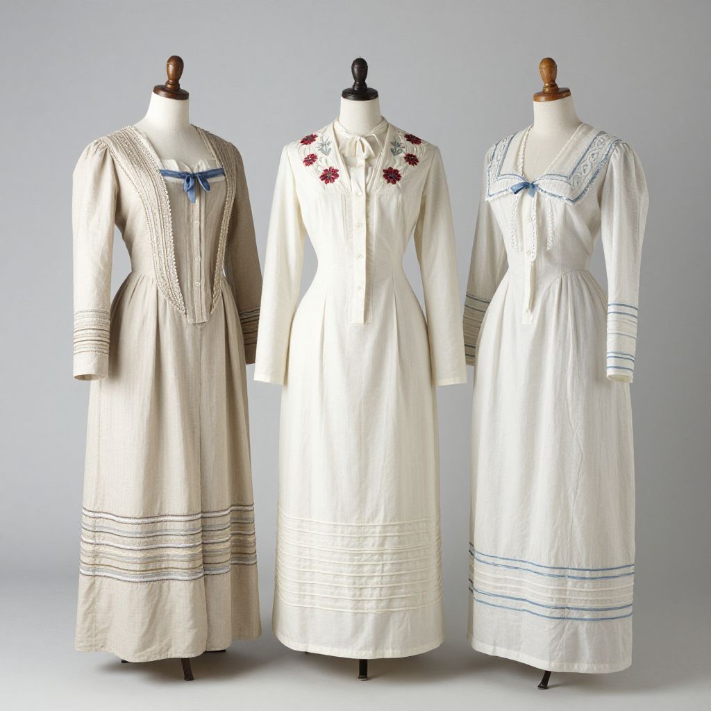 Photograph of three vintage, long-sleeved, floor-length dresses displayed on wooden dress forms against a plain gray background. The left dress is white with delicate floral embroidery on the collar and sleeves. The center dress is also white, featuring similar floral embroidery on the collar, with a slightly more fitted silhouette. The right dress is light blue with a high, ruffled collar, and intricate embroidered patterns on the collar and lower hem, including horizontal stripes. Each dress is crafted from lightweight, flowing fabric, showcasing early 20th-century fashion.