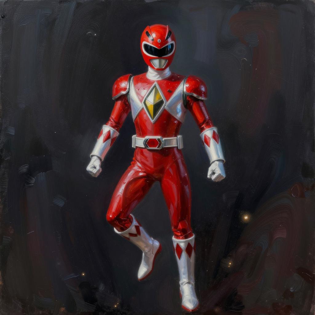 Apothecary acrylic painting of [Red Ranger] [Full-Body,Half-Body] Superhero, floating, fluid and liquid brush strokes, wet and glistening paint, portrait painting, extremely detailed, poignant pose, glowing particle lighting, elegant,