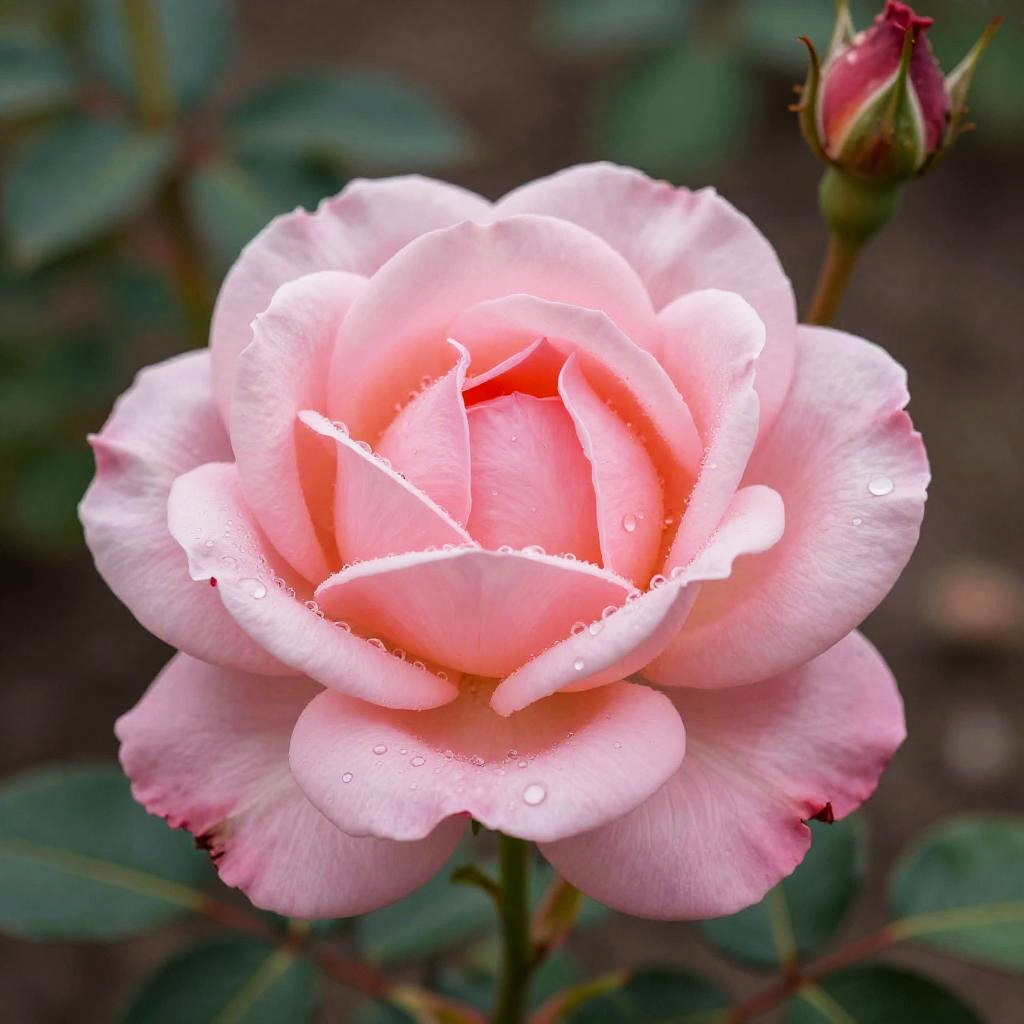 Rose reference image, a macro shot of a blooming pink rose with water droplets, crisp focus on petals, blurred garden background, vibrant and fresh atmosphere