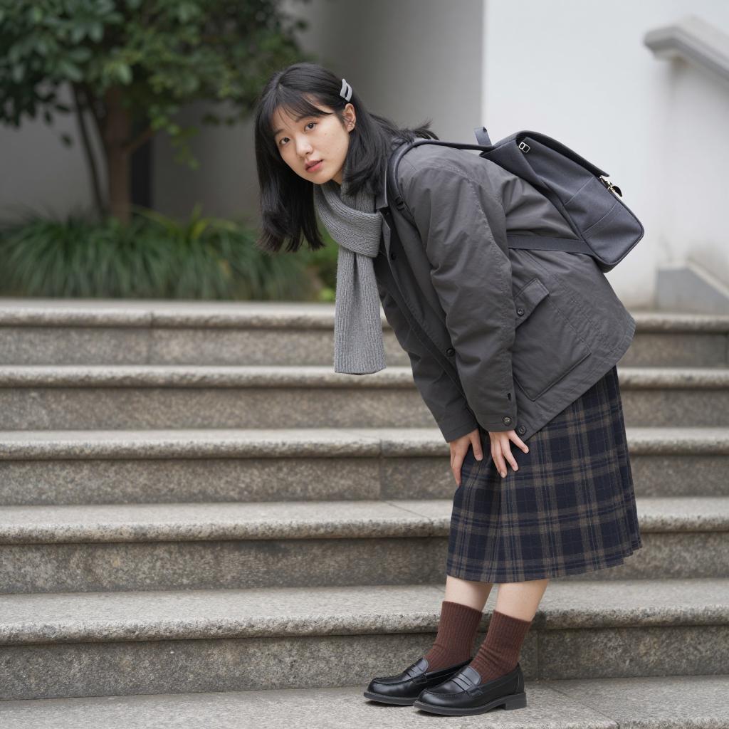 Asian woman with short black hair, wearing a black coat, green plaid scarf, gray skirt, and black tights, standing against a chain-link fence. Snowing, holding a white and blue package in her right hand. She looks to the side with a neutral expression. Snowflakes on her hair and coat. Background includes the chain-link fence and blurred urban elements.