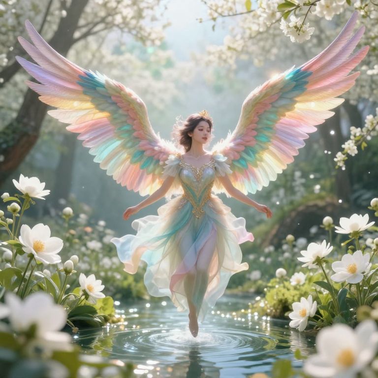 Digital artwork of a ethereal, fair-skinned woman with large, rainbow-colored wings standing in a serene, sunlit forest pond. She wears a flowing, translucent, pastel-colored dress adorned with delicate, golden embellishments. Her dark brown hair is softly curled, and she gazes serenely forward. The pond is surrounded by white water lilies and green foliage, with sunlight filtering through the trees in the background. Her wings are spread wide, creating a radiant halo effect. The water ripples gently beneath her bare feet. The overall style is magical and dreamlike, with a soft, glowing aesthetic.