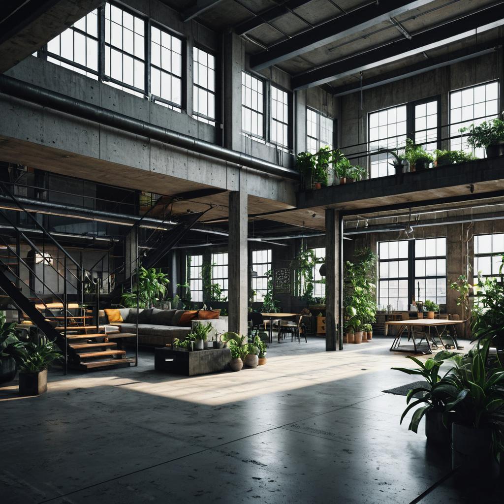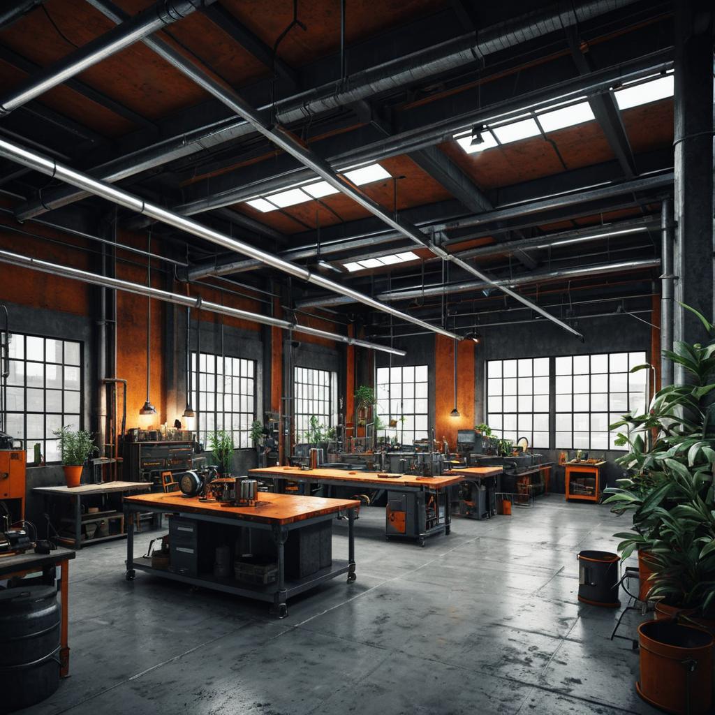 Photorealistic CGI render of a industrial workshop loft. Features harsh spotlights, exposed metal pipes with grey and rusty orange tones, with realistic textures, plants as decoration, and a stretchable open space.