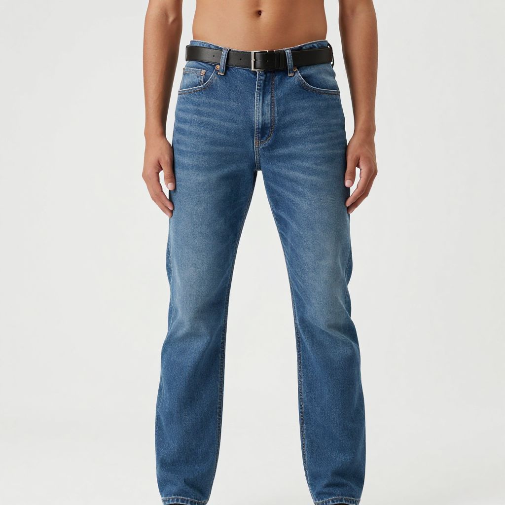 Photograph of a person's torso and lower body, showing them from the waist down. They are wearing blue, straight-leg jeans with a black leather belt. The jeans have visible stitching, pockets, and a slightly faded texture. The person's skin is light-toned, and their hands rest naturally by their sides. The background is entirely white, making the jeans the focal point. The image is well-lit, highlighting the fabric's texture and color. No other objects or people are visible.