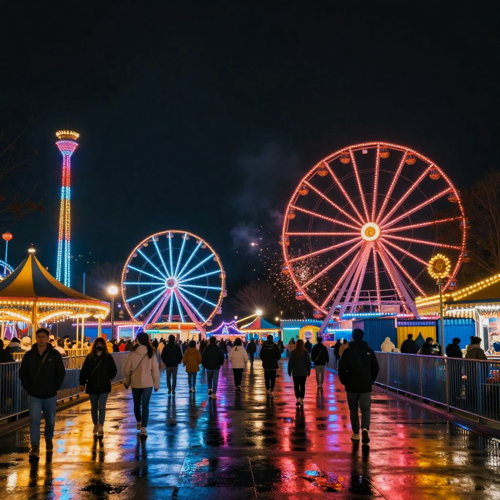 Night view of Gardaland amusement park illuminated by dazzling neon lights, rides glowing vibrantly against the dark sky, festive crowd enjoying attractions, detailed reflections on wet surfaces, cinematic atmosphere with glowing sparks and dynamic composition.