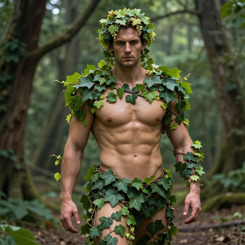 A striking figure in an enchanting forest setting, this image features a man adorned with lush green ivy and grapevines. His sculpted physique and ethereal presence evoke a mythical aura, blending seamlessly with the vibrant natural surroundings.