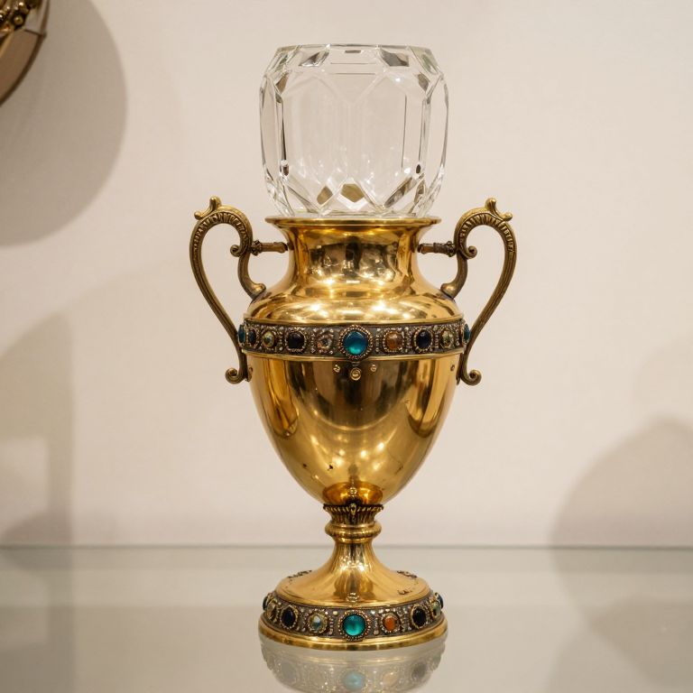 Golden vase featuring intricate brass handles and a gemstone-adorned base, topped with a faceted glass container, showcased at Trendz & Traditionz Boutique.