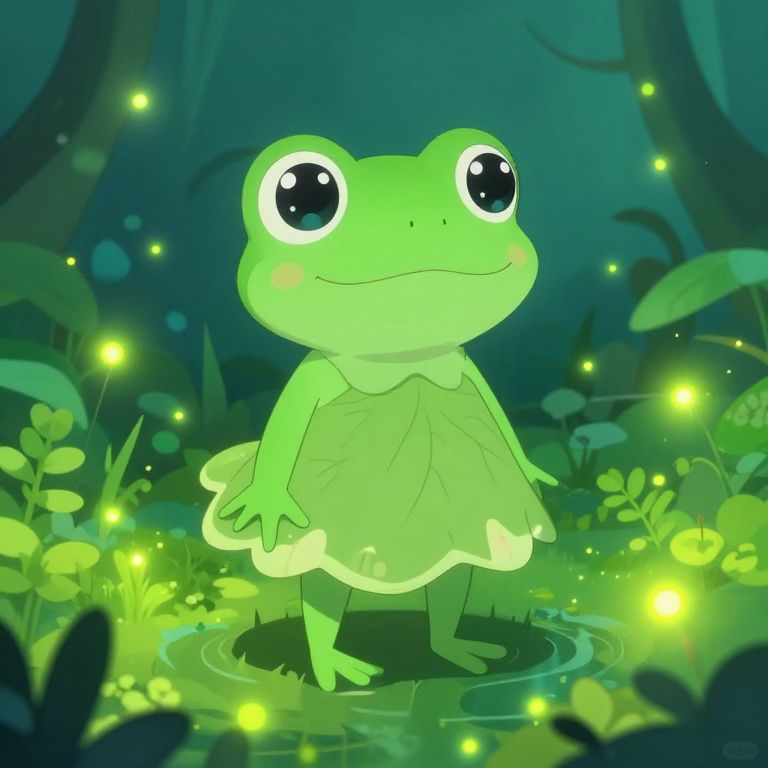 Anime frog girl standing in a mystical swamp, luminous fireflies glowing around her, wearing a delicate lily pad dress, large expressive eyes reflecting the moonlight, surrounded by vibrant green foliage, fantasy art style with soft pastel colors.