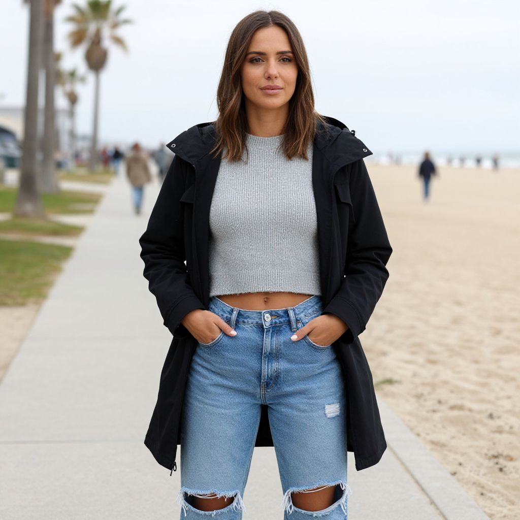 Photograph of a woman standing on a beachside sidewalk. She has light brown skin, shoulder-length brown hair, and is wearing a black hooded jacket over a gray cropped sweater, and high-waisted, ripped blue jeans. Her hands are in her jacket pockets. The background shows a sandy beach, palm trees, and a few people walking. The sky is overcast.