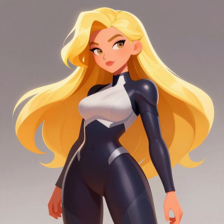 This vibrant and stylized digital illustration features a female character with striking long, blonde hair and a sleek, form-fitting outfit. The artwork is characterized by its smooth textures and playful proportions, capturing a whimsical yet confident essence.
