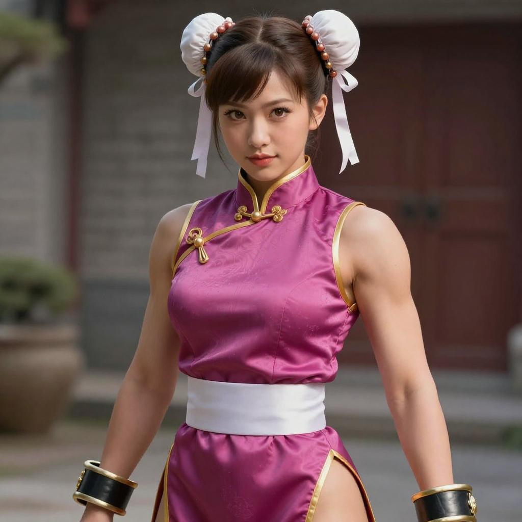 1girl, (chun-li), solo, brown eyes, brown hair, missymuscle-8100, double bun, bright colours, chinese dress, street fighter, ((realistic))