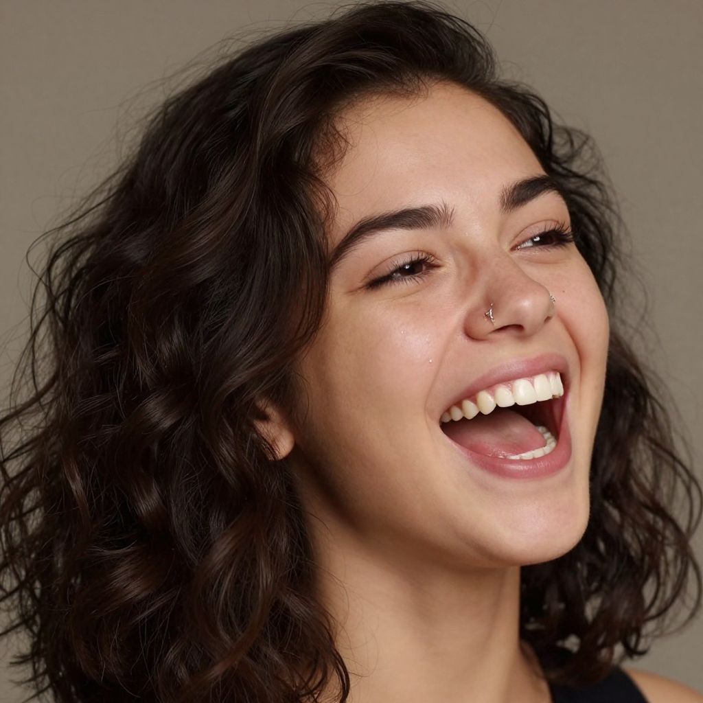 A candid photograph captures a spirited young woman from an oblique angle in mid-laugh, revealing dimples and light freckles scattered across the bridge of her nose—her dark curls cascading over one shoulder like molten chocolate, framing her face with warmth and vitality.