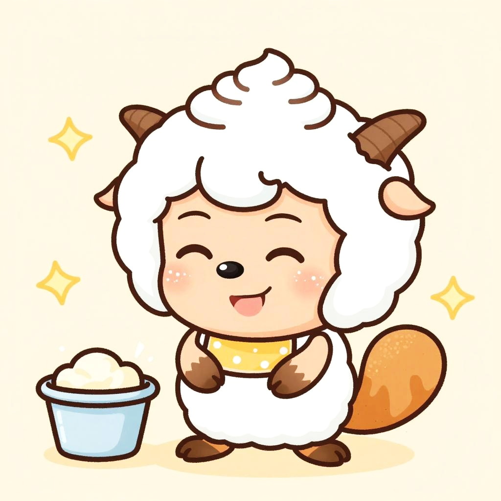 Chibi-style mischievous squirrel baker with sheepish grin with flour-dusted cheeks, soft shading, and warm pastel palette,