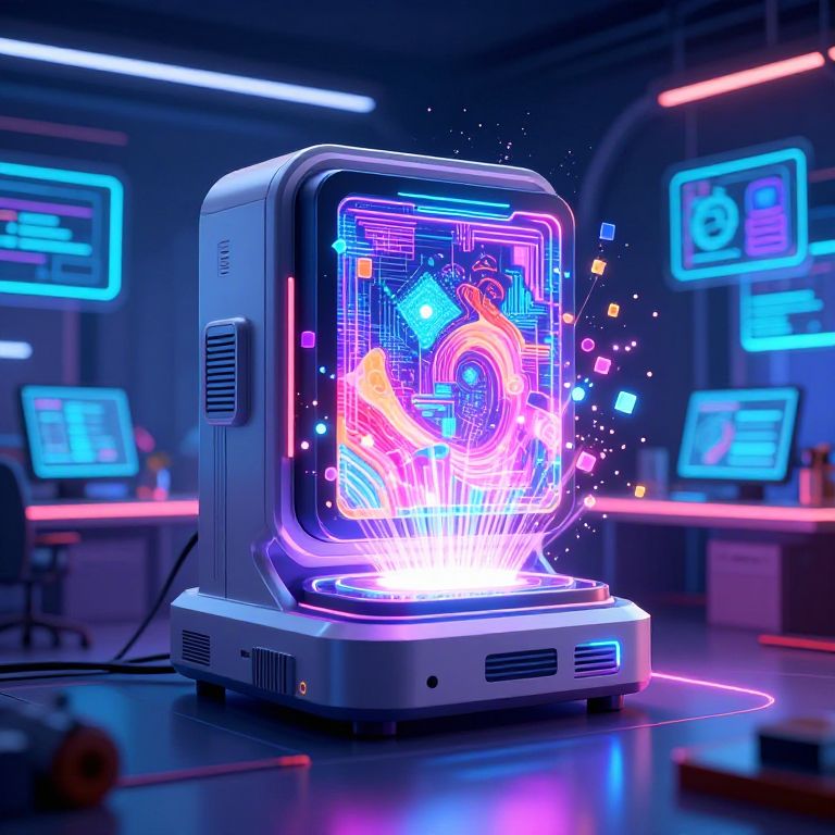Image generator concept showcasing a futuristic AI machine creating vibrant digital art in a high-tech studio with neon lights and holographic displays, surrounded by floating pixels and creative energy bursting from the device.