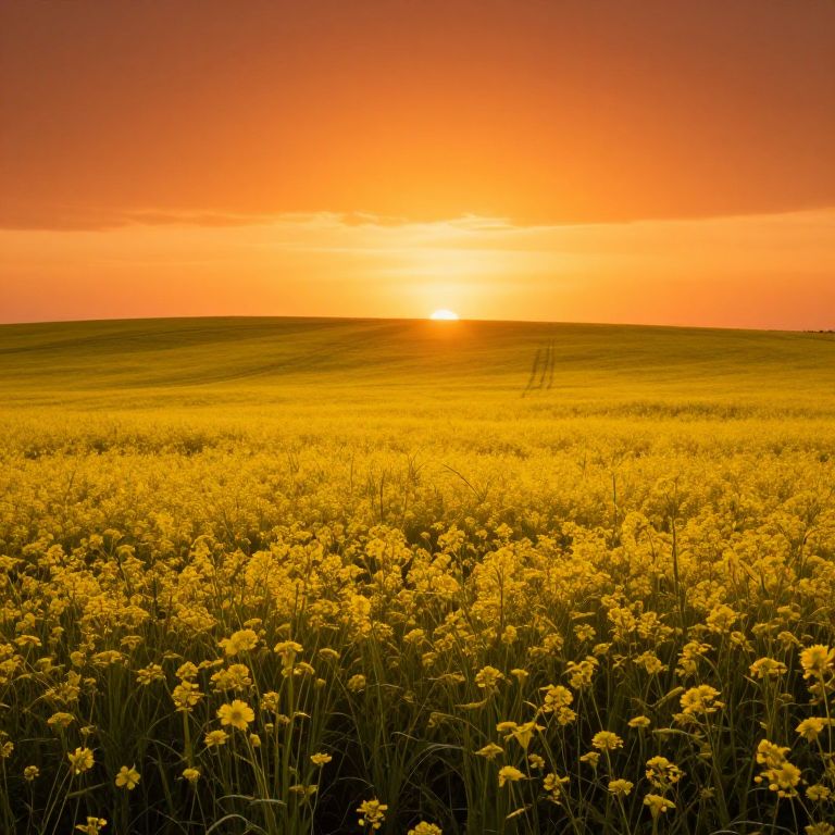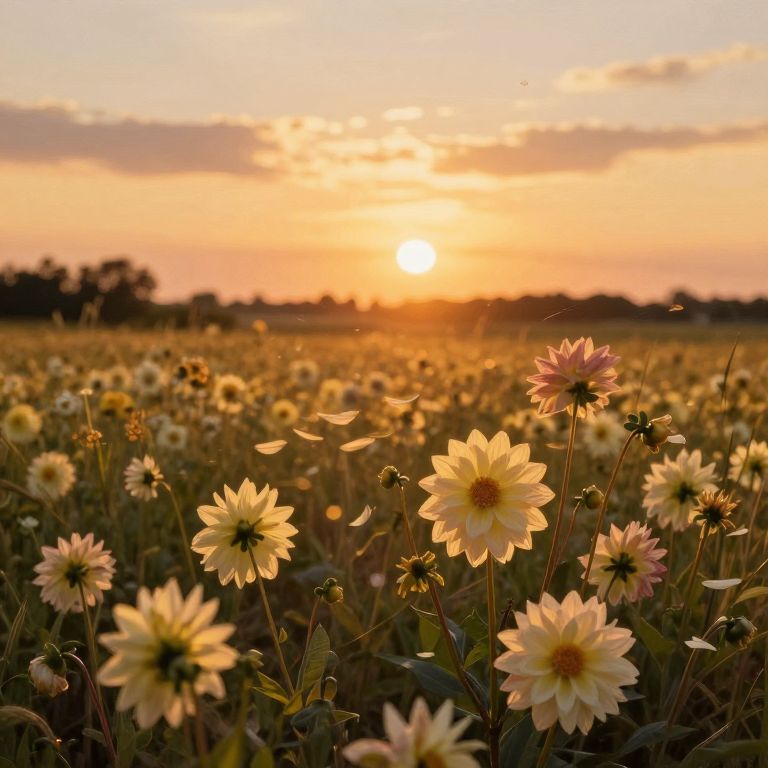 A field of dahli under a sunset sky, warm golden hues casting long shadows, soft breeze moving petals, impressionist painting style with focus on light and color blending, peaceful rural landscape with wildflowers and distant trees