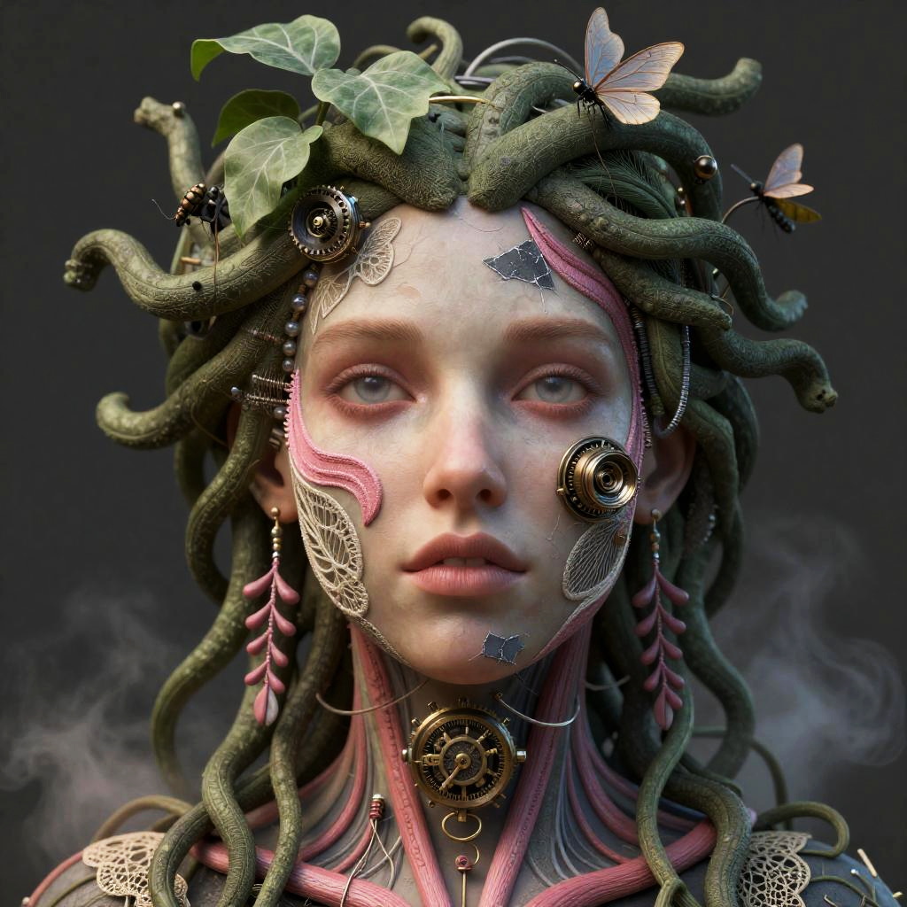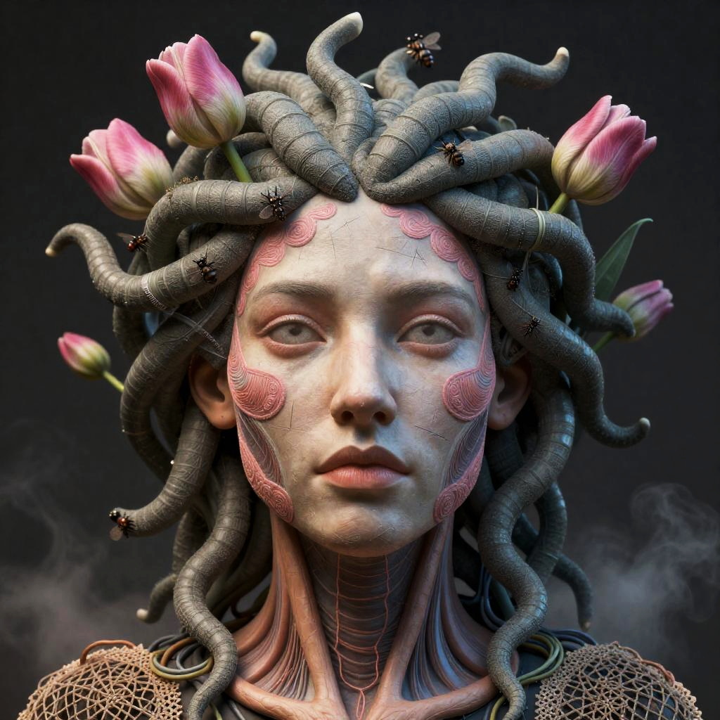 Cinema 4d colorful render, organic, ultra detailed, of a painted realistic face with growing tulips, scratched. steampunk creature, medusa head, analog, macro lens, beautiful natural soft rim light, smoke, veins, neon, winged insects and stems, roots, fine foliage lace, pink and pink details, art nouveau fashion embroidered, intricate details, mesh wire, computer components, anatomical, facial muscles, cable wires, elegant, hyper realistic, ultra detailed, 8k post-production