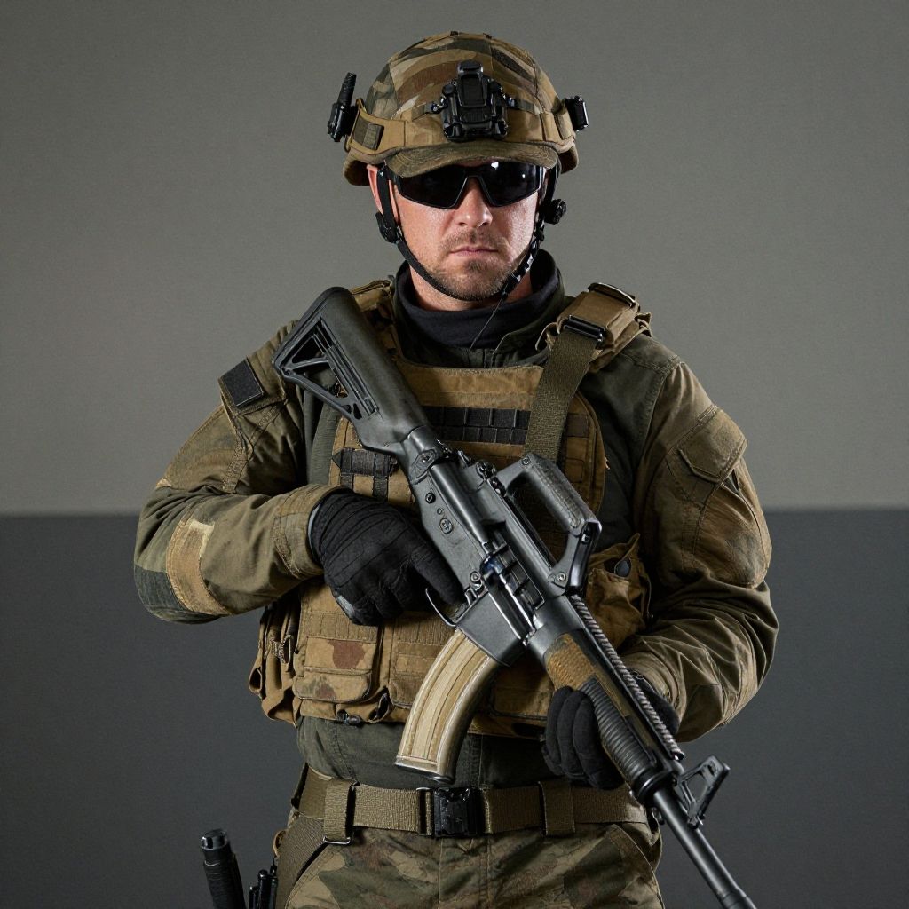A man dressed in tactical military gear stands alertly, holding a rifle with a firm grip. The image features cinematic realism with dramatic lighting that emphasizes his focused expression and detailed combat attire.