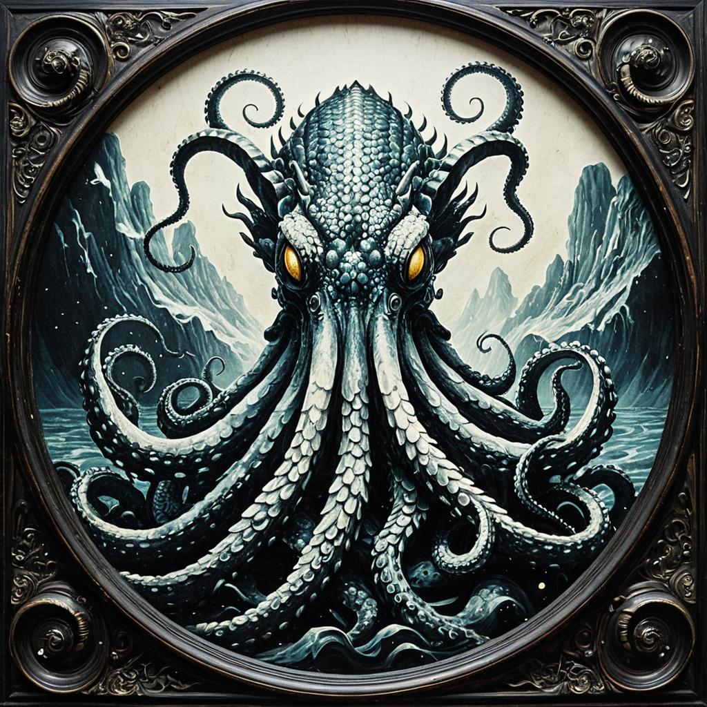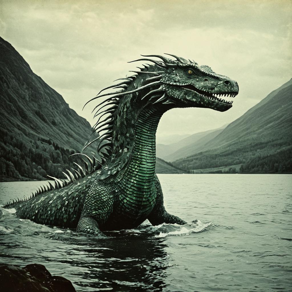 A strikingly mystical loch ness monster, reminiscent of a large, magical female monster, takes center stage in this vintagepunk artwork. The image, possibly a captivating painting or a carefully captured photograph, showcases an awe-inspiring murky green scaled creature with an ethereal aura. Its mottled shade of white encompasses a weathered yet mesmerizing appearance, emanating an air of enigmatic beauty. Every minute detail of this creature's otherworldly form, from its intricate scales to its flowing mane, is portrayed with exquisite quality, capturing the viewer's attention. This artistry exudes a sense of vintage charm while simultaneously evoking a futuristic essence, lending the image a unique and captivating appeal.