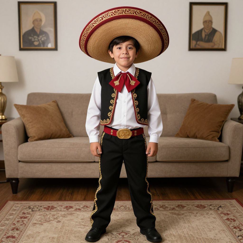 Photograph of a young boy in traditional Mexican outfit, large sombrero, white shirt, black vest, red bowtie, standing in living room with