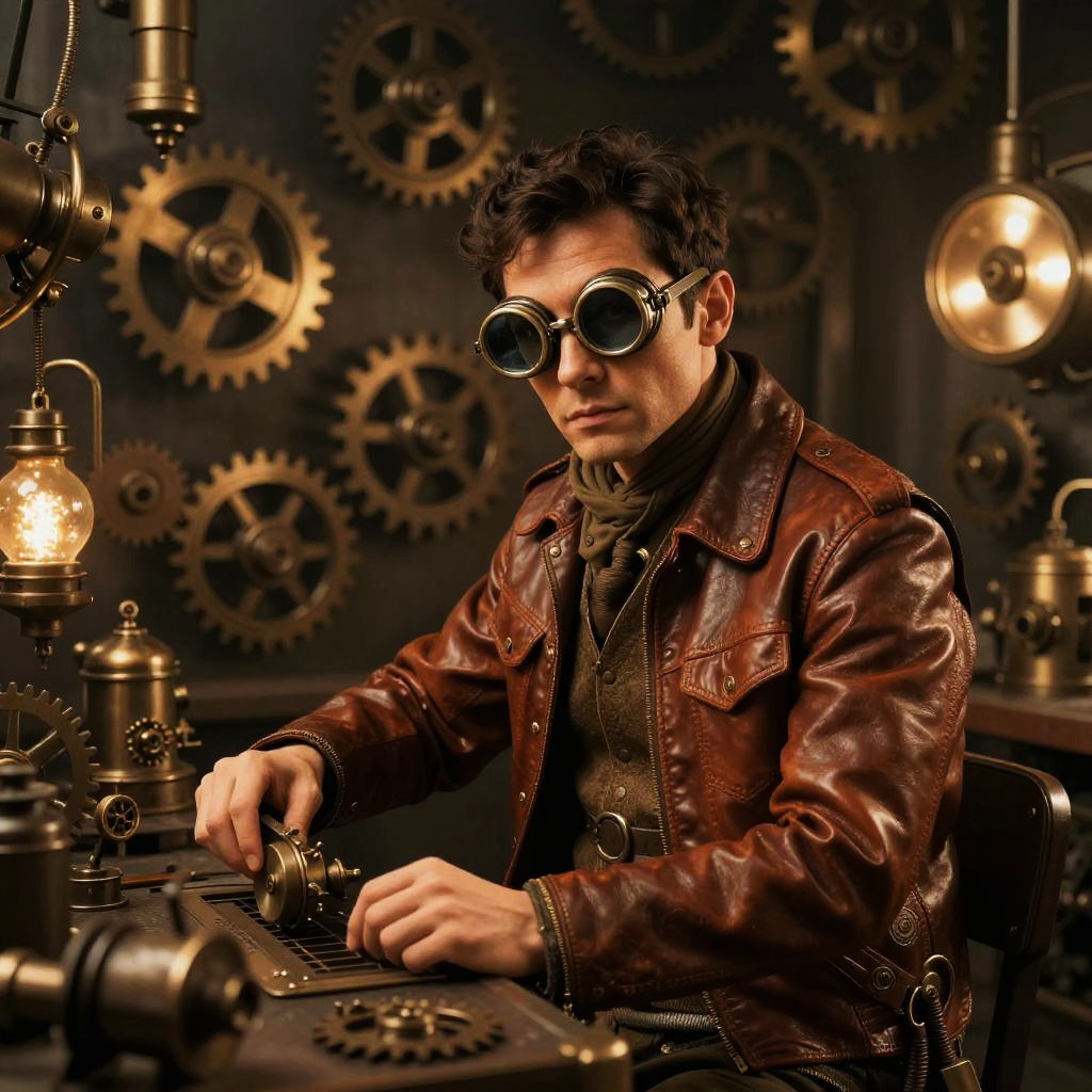 Enterie in a steampunk workshop filled with gears, pipes, and glowing gadgets, wearing vintage goggles and leather attire, warm sepia tones with detailed mechanical background, imaginative and rich in texture and ambiance.
