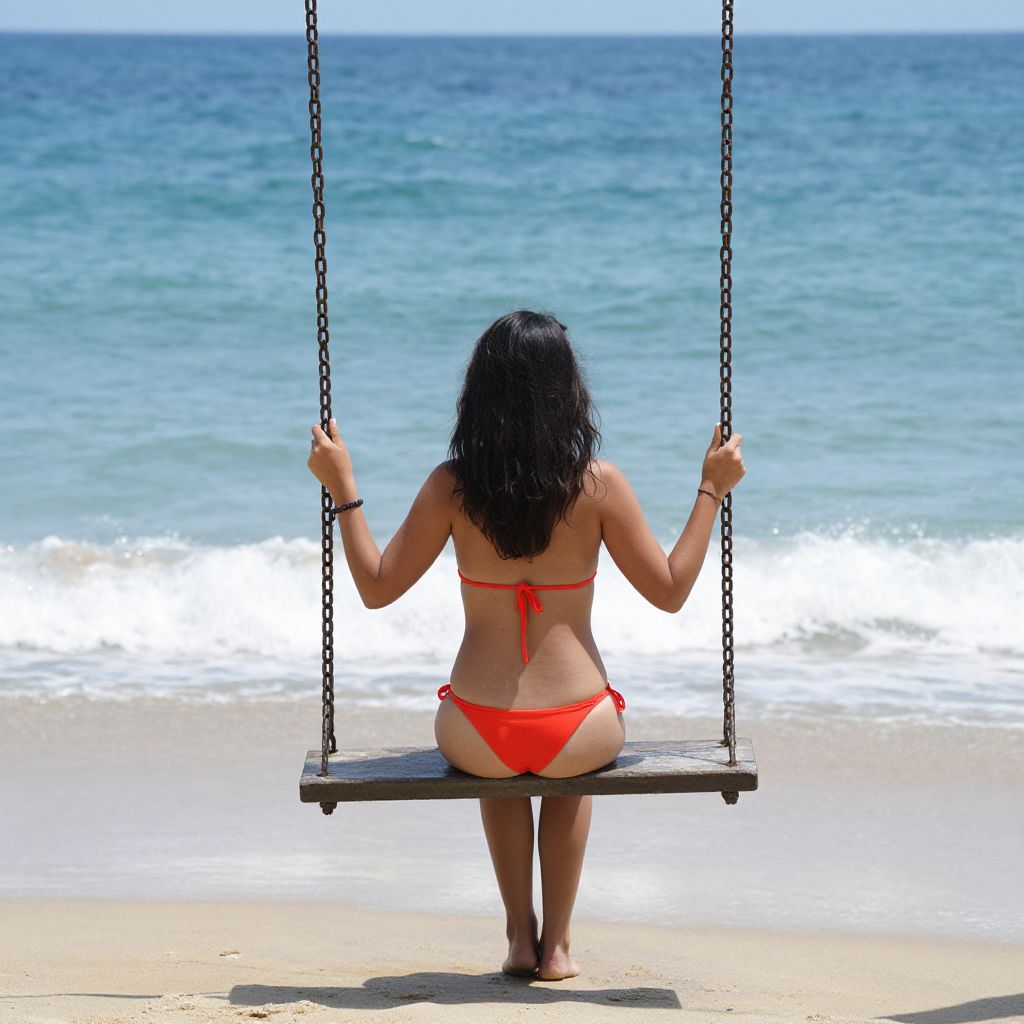 Woman sitting alone on a wooden swing suspended by dark chains, wearing a vibrant red bikini, facing the ocean as waves gently roll onto the sandy shore, evoking a sense of solitude and longing for companionship.