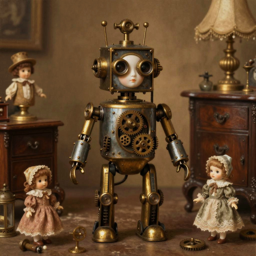 Doll-E, a vintage steampunk-inspired doll robot with brass gears and delicate porcelain face, surrounded by Victorian-era toys and ornate furniture, warm sepia tones, detailed textures, painterly style