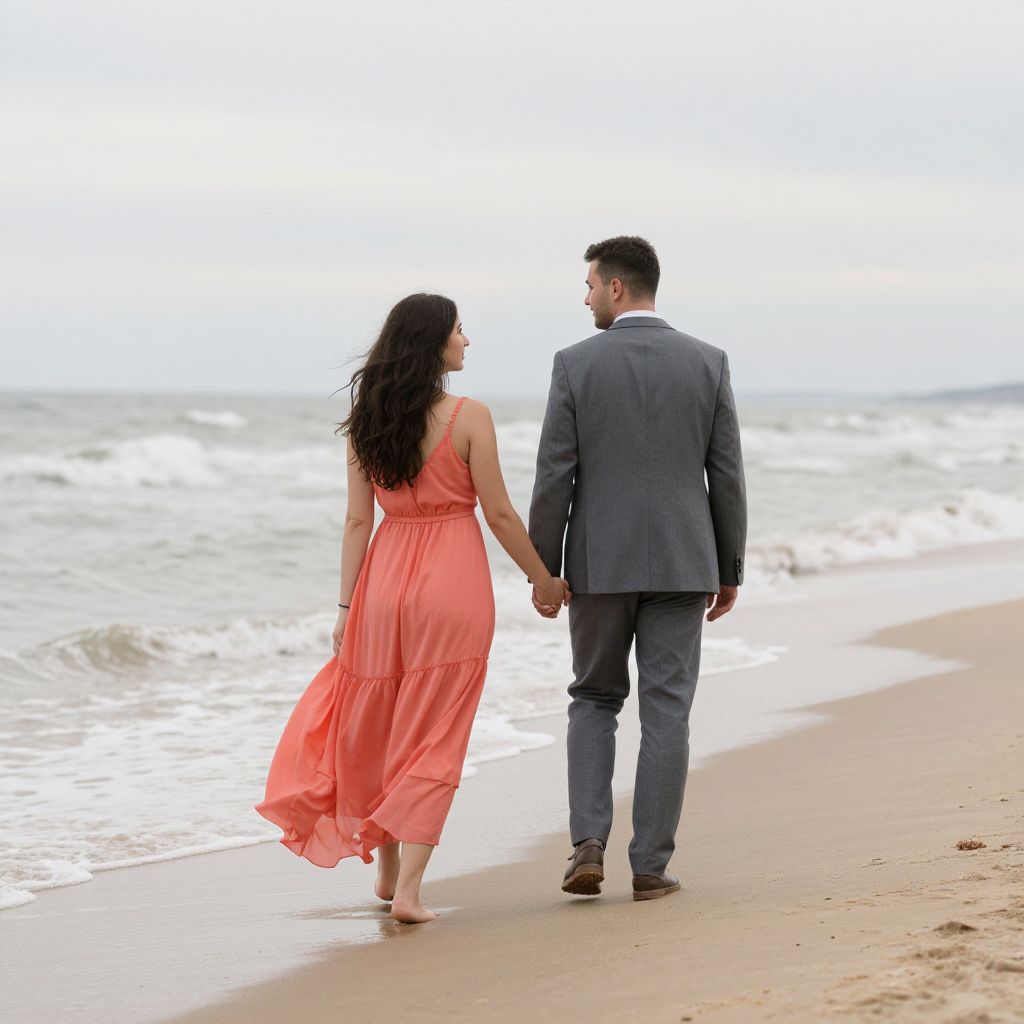 Two individuals walk hand-in-hand along a sandy beach, with the woman wearing a flowing coral dress and the man dressed in a gray suit, as gentle waves lap at their feet under a soft, overcast sky.