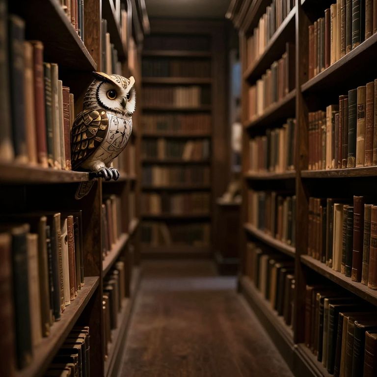 Photograph of a dimly lit library aisle with tall, wooden bookshelves on both sides, filled with books of various sizes and colors. At the center-left, a detailed owl sculpture with brown and white feathers perches on a shelf, its eyes glowing softly in the low light. The background fades into darkness, emphasizing the depth of the aisle. The floor is dark and slightly worn, adding a sense of age and history to the setting. The overall atmosphere is quiet and mysterious, with a focus on the owl as a subtle, artistic element.
