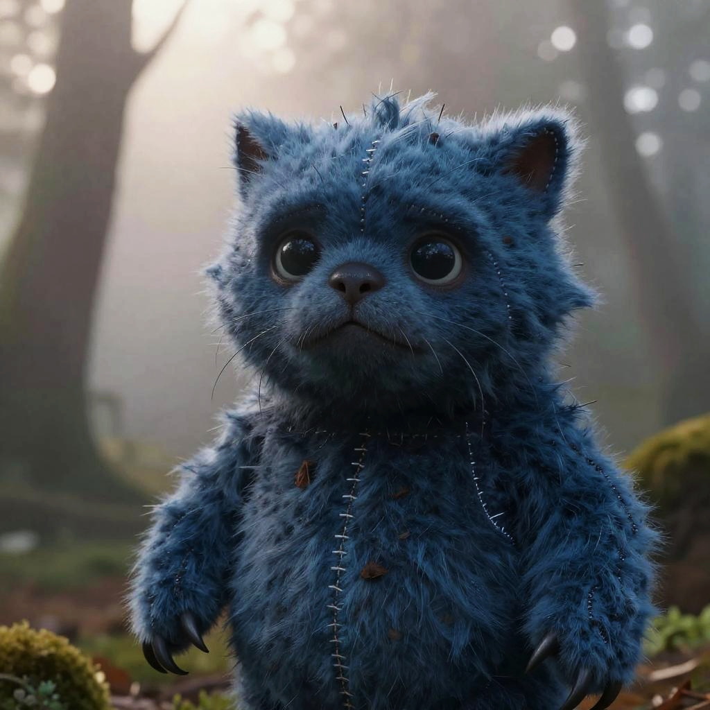 Realistic Huggy Wuggy standing tall in a misty forest at dawn, close-up on textured blue fur and wide eyes, hyper-detailed fabric stitching and clawed fingers, soft natural light filtering through the trees, creating a haunting yet tragic character portrait in ultra-realistic style.