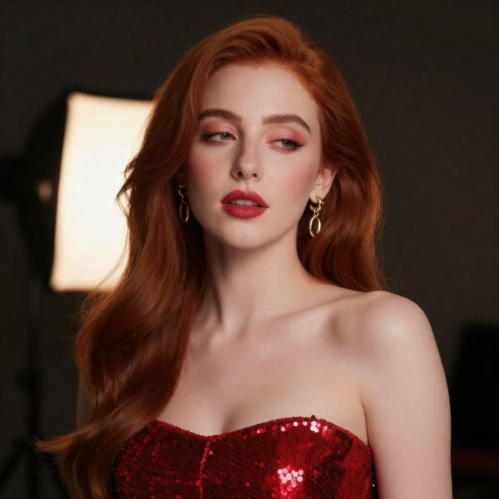 Digital portrait of a woman with long red hair, wearing a red sequin strapless top. She has gold earrings, pink eyeshadow, and red lipstick. Her head is slightly tilted, eyes half-closed, lips slightly parted. Dark background with a glowing light source behind her.