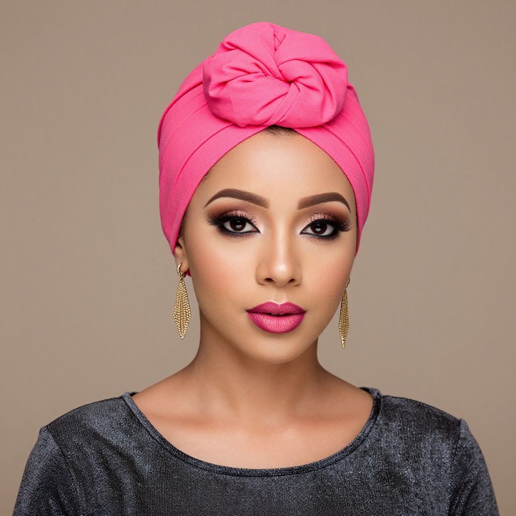 Elegant woman wearing a vibrant pink turban styled with a prominent knot atop her head, complemented by bold makeup featuring dramatic eyeliner, voluminous lashes, and matching pink lipstick, accessorized with dangling earrings and a shimmering gray top.