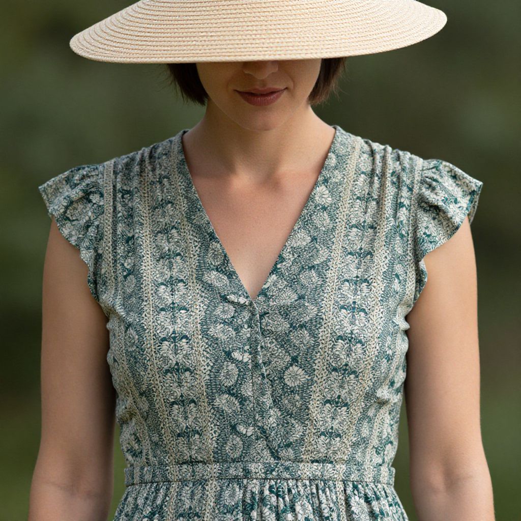 Photograph of a light-skinned woman from the shoulders to the waist, wearing a sleeveless, V-neck dress with a blue and white floral pattern. She has short, dark brown hair partially covered by a wide-brimmed, straw sun hat. The background is a blurred, dark green, suggesting an outdoor setting with trees. Her expression is slightly visible, showing a subtle smile. The lighting is natural, highlighting the texture of the fabric and the straw hat. The image has a slightly high-contrast, almost painterly style.