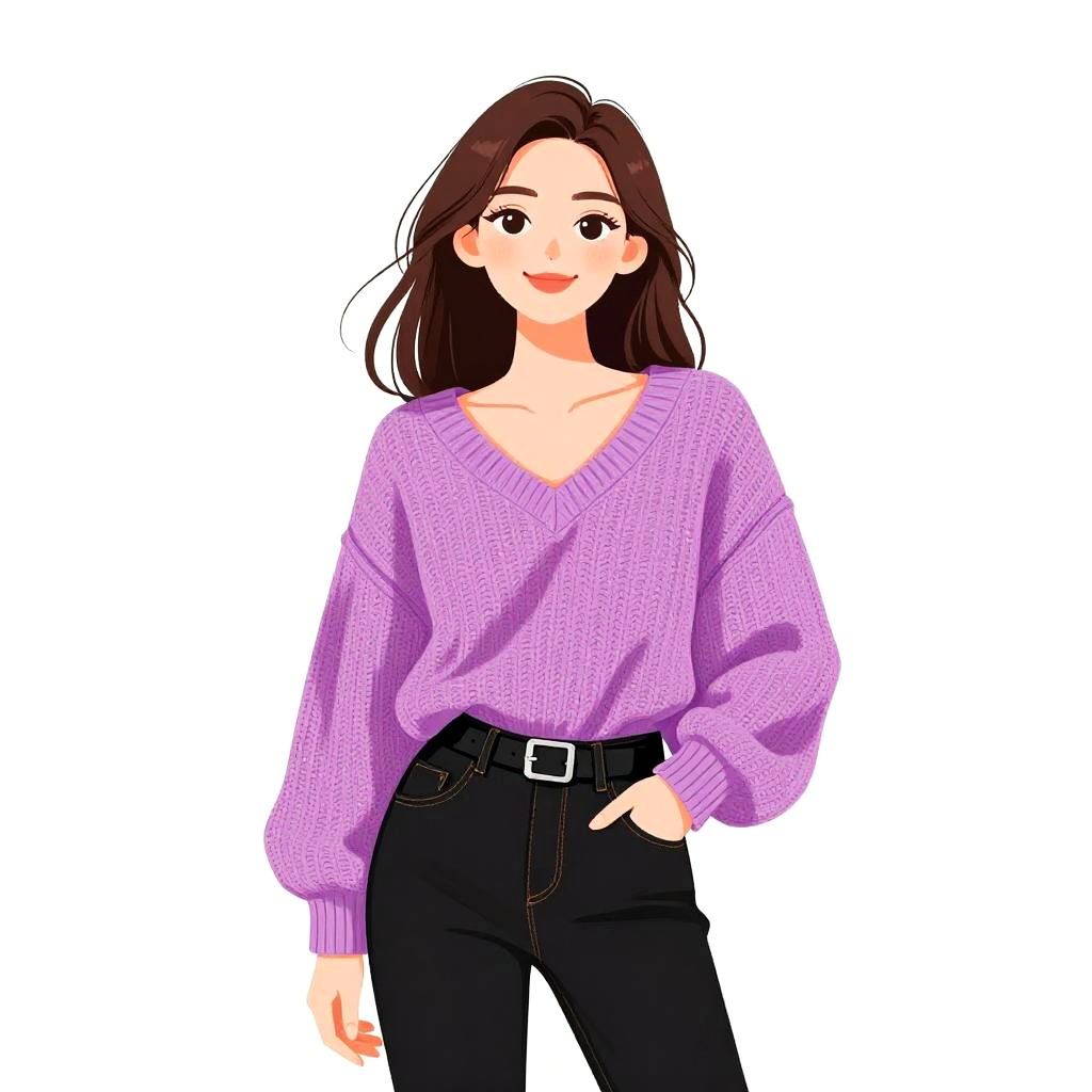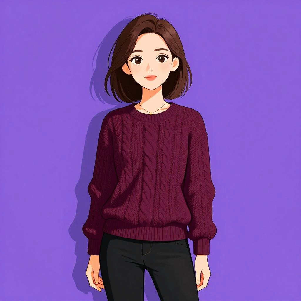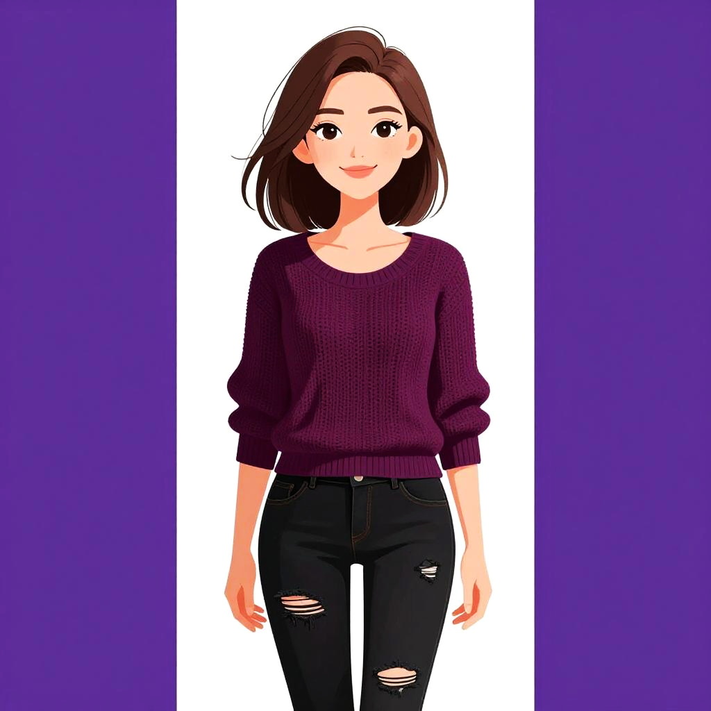 Woman with pretty face and pretty hair. smiling Woman, casual streetwear, burgundy textured knit sweater with a scoop neck and long sleeves, black distressed skinny jeans with horizontal rips at the knees, white background. --sref 1467