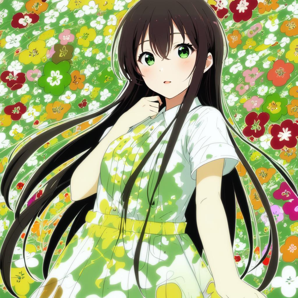 Hanazono tae, bang dream!, 1girl, green eyes, hair between eyes, long hair, black hair, brown hair, sidelocks, medium breasts, by artist tsukimori usako, anime