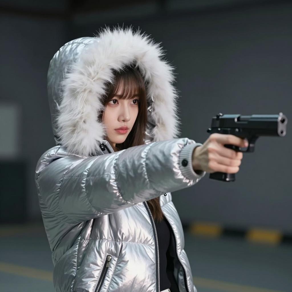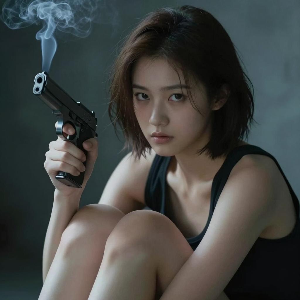 Young woman with short brown hair, light blue eyes, and a serious expression, wearing a gray V-neck shirt, holds a gun, aiming forward. Dimly lit room with a candle on the right, ornate pillar, and ured walls.