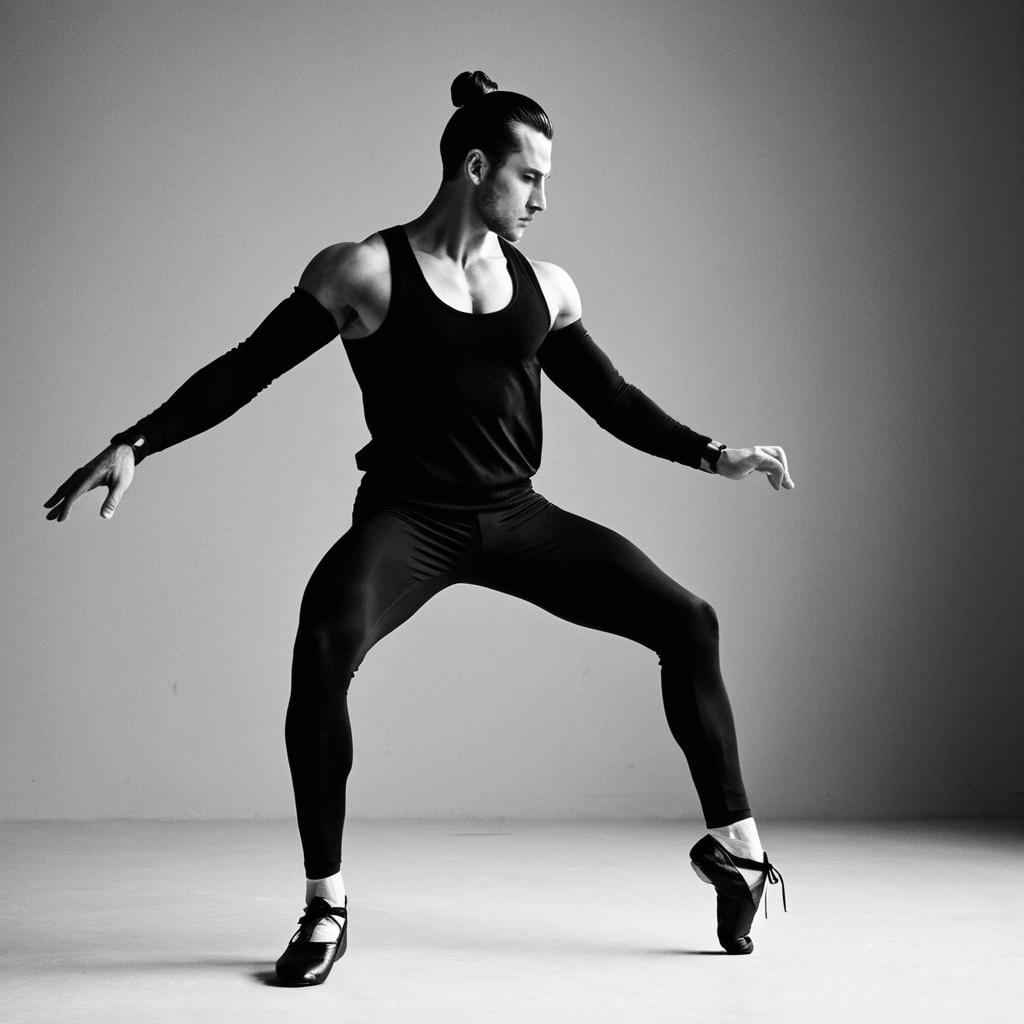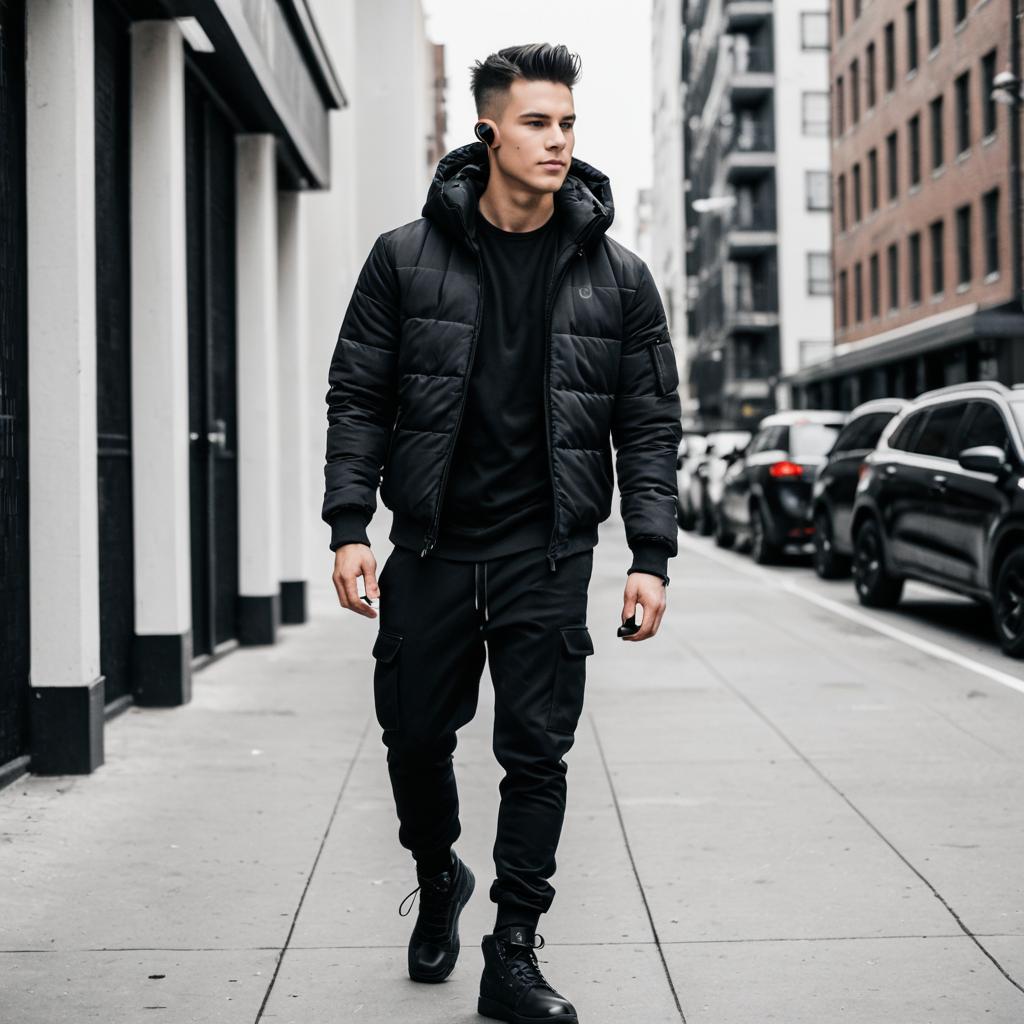 Energetic young man, sleek undercut, lean physique, all black outfit men, sleek monochrome style, black zip-up hoodie, black puffer jacket, black jogger pants, black combat boots, black wireless earbuds, urban casual