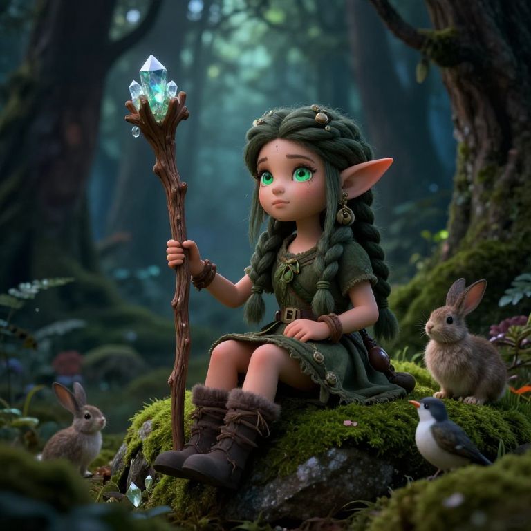 Digital artwork of a cute, green-eyed, elf-like girl with braided hair and pointed ears, sitting in a forest, holding a glowing crystal staff