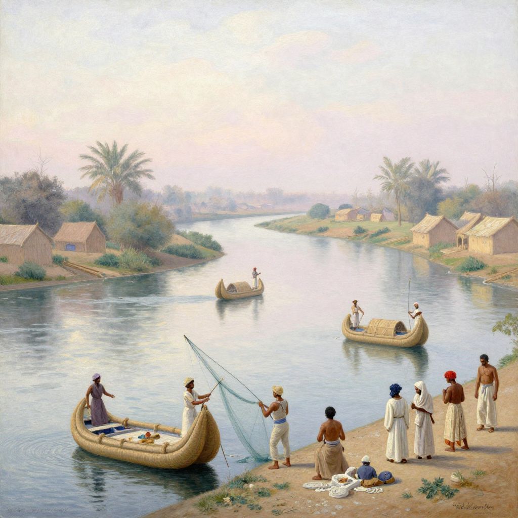 Mesopotamia river scene showing the confluence of the Tigris and Euphrates, small reed boats floating, fishermen casting nets, villagers in simple linen clothes by the riverside huts, early morning mist, soft pastel palette, impressionist style