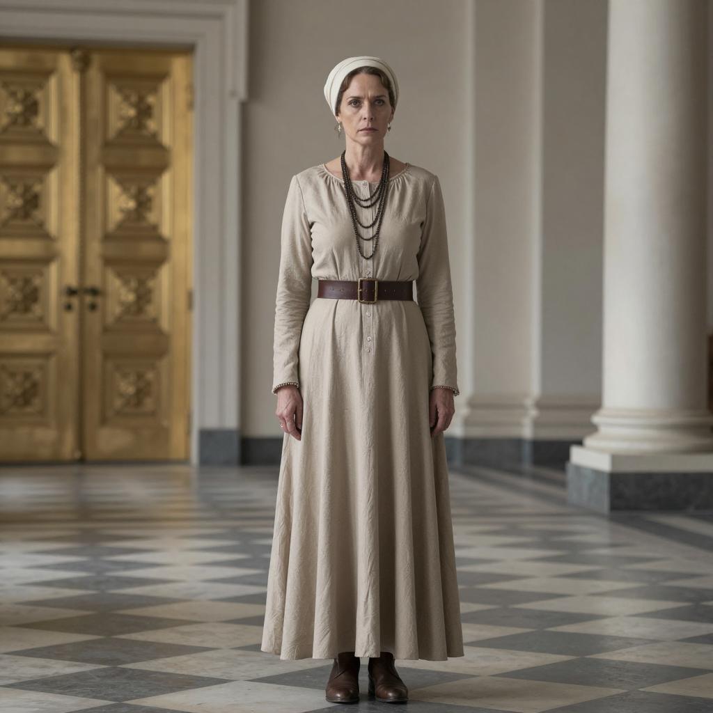 Photograph of a woman standing indoors between two white columns wearing a red long-sleeved dress with button details and a white collar, paired with a white headscarf and black boots. The outfit resembles a costume inspired by The Handmaid's Tale. The background is minimal and neutral with bright lighting highlighting the formal and detailed attire.