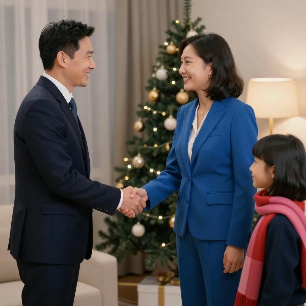 Photograph of a man in a dark suit shaking hands with a woman in a blue suit, both smiling. A young girl with dark hair in a red and pink scarf stands to the right. Background includes patterned curtains, a Christmas tree with lights, and a lamp.