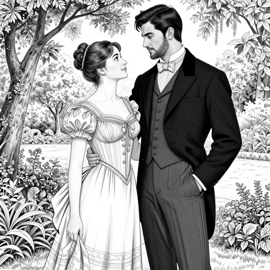 The image is a highly detailed, black-and-white illustration that captures a romantic scene in a garden. The central figures are a beautiful young woman and a tall, handsome young man, both dressed in elegant, period-appropriate attire. The woman, with her intricate hairstyle and delicate dress, stands gracefully, her arm tenderly placed in the man's. The man, with his well-groomed beard and formal suit, exudes confidence and charm. They are surrounded by lush, verdant foliage, with trees and bushes framing the scene. The overall composition is reminiscent of the styles of Charles Dana Gibson, Walter M. Baumhofer, Norman Rockwell, Coles Phillips, and J.C. Leyendecker, characterized by their polished, cinematic, and highly detailed clothing. The image is designed for adult coloring pages, with intricate textures and patterns that add depth and realism to the scene. The spatial relationships between the figures and the surrounding nature create a harmonious balance, evoking a sense of timeless romance and elegance.