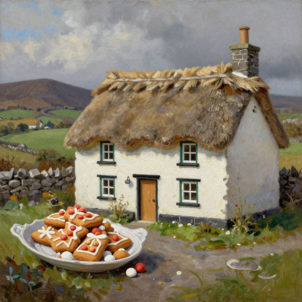 Oil painting, classic still life, Irish landscape, gingerbread cottage, lucky charms overflowing, traditional thatched roof, rustic stone chimney, dramatic lighting, hyperrealistic texture, detailed brushwork