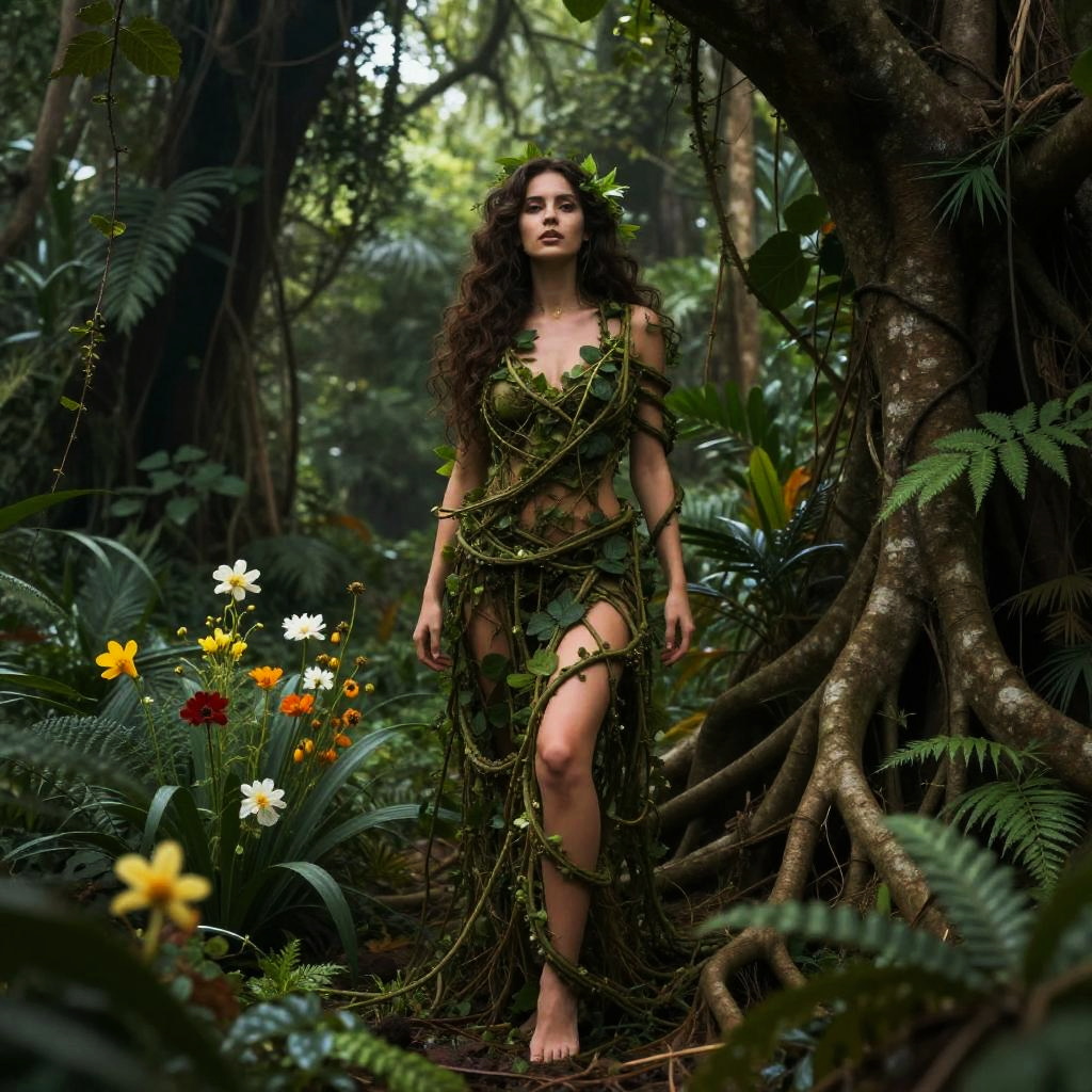 Photograph of a dark-haired woman with curly hair, wearing a leafy, vine-adorned dress, standing in a lush, tropical forest with