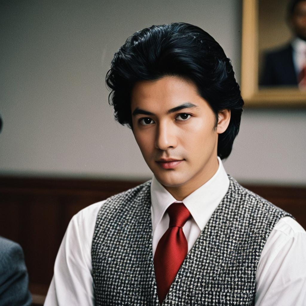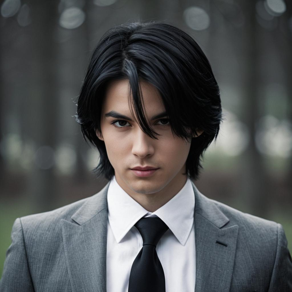 Beatles fancy dress,necktie, male focus, 1boy, red necktie, suit, realistic, formal, looking at viewer, jacket, black hair, shirt, white shirt, outdoors, brown eyes, tree, collared shirt, solo focus