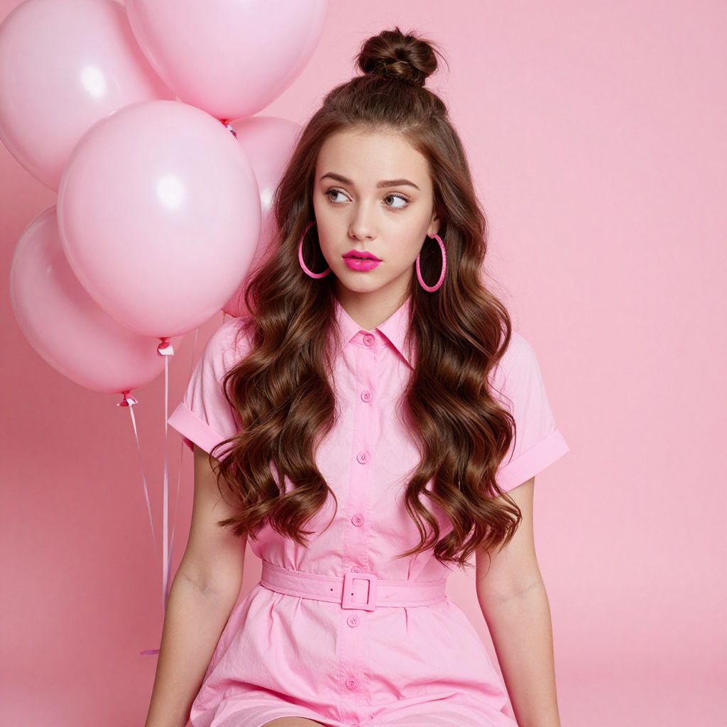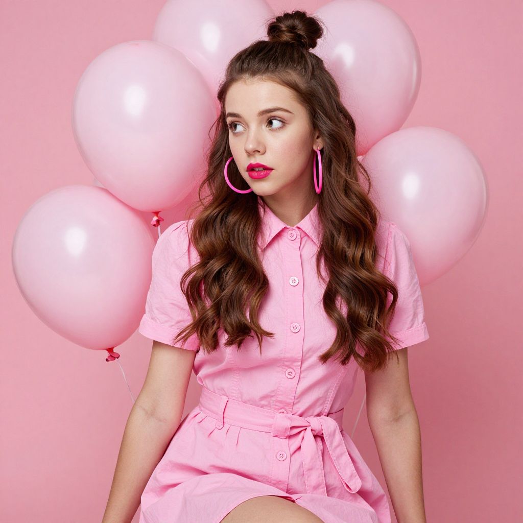 A photograph of a young woman with long, wavy brown hair, styled in a top bun, sitting amidst a cluster of pink balloons. She's wearing a pink, button-up, belted dress with large, pink hoop earrings. Her makeup is bold with bright pink lipstick. The background is a solid pink, enhancing the playful, vibrant feel of the image. She's looking slightly to the side with a contemplative expression.