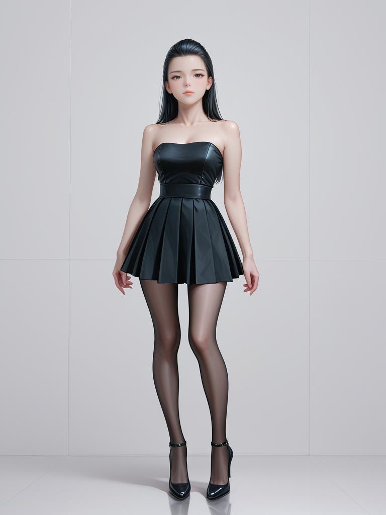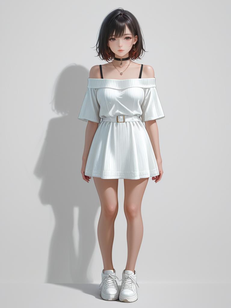 1girl, realistic face, full body shot, Woman, form-fitting elegance, ribbed knit dress in burgundy, high neck, long sleeves, thigh-length, tan thigh-high suede boots with pointed toes, white studio background.